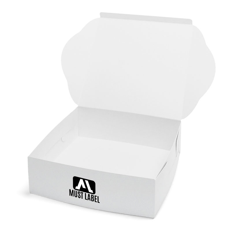 Must Labels fabrikk produserer skreddersydde kakebokser. Våre førsteklasses pappkakebokser, den perfekte løsningen for bakerier, kafeer og cateringfirmaer som søker en pålitelig og attraktiv måte å presentere og transportere sine bakte mesterverk på. Disse boksene er ekspertdesignet for å beskytte og vise frem en rekke kakestørrelser og -stiler, og sikre at de når kunder i upåklagelig stand.